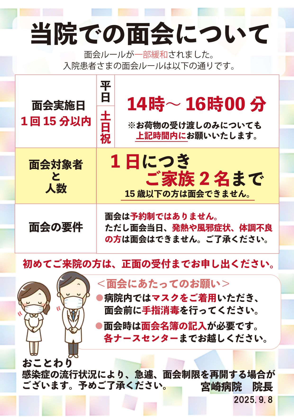 9月8日より感染対策は継続しながら、ご家族の面会の体制を変更(制限緩和)いたします。